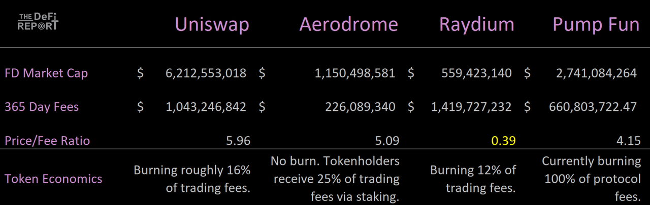 然而,就代币经济和代币持有者的增值而言,它现在将 UNI 持有者置于一个相同的竞争环境中。如上所示,相对于同行,Raydium 似乎被严重低估了。
