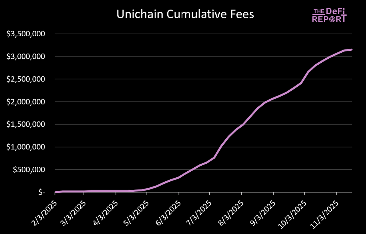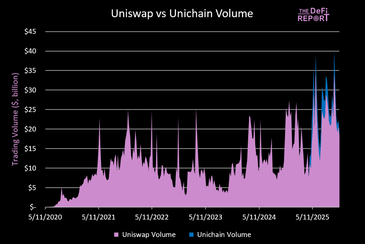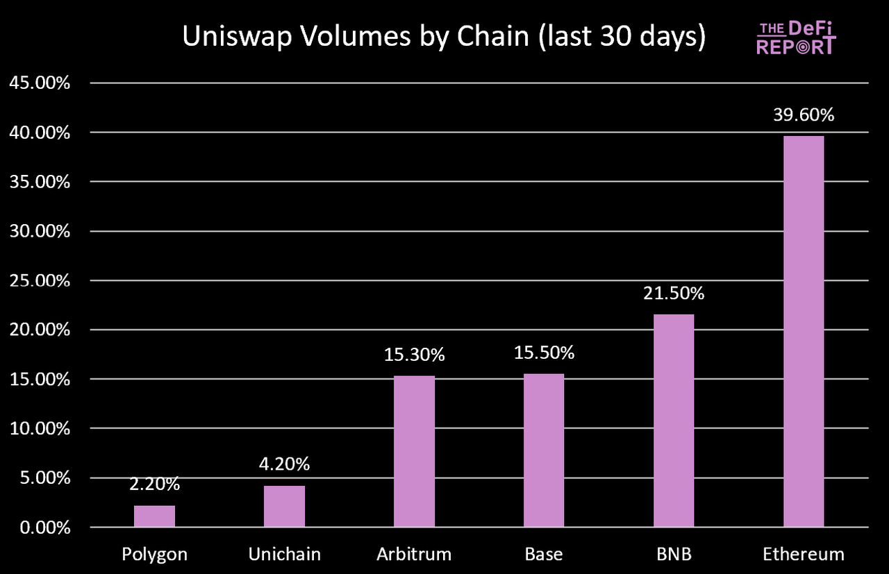 作为参考,BNB 链占比从一年前的 2% 上升,Base 链占比较一年前的 15.3% 也有所上升。最后,Unichain 目前占 Uniswap 总交易量的 4.2%。