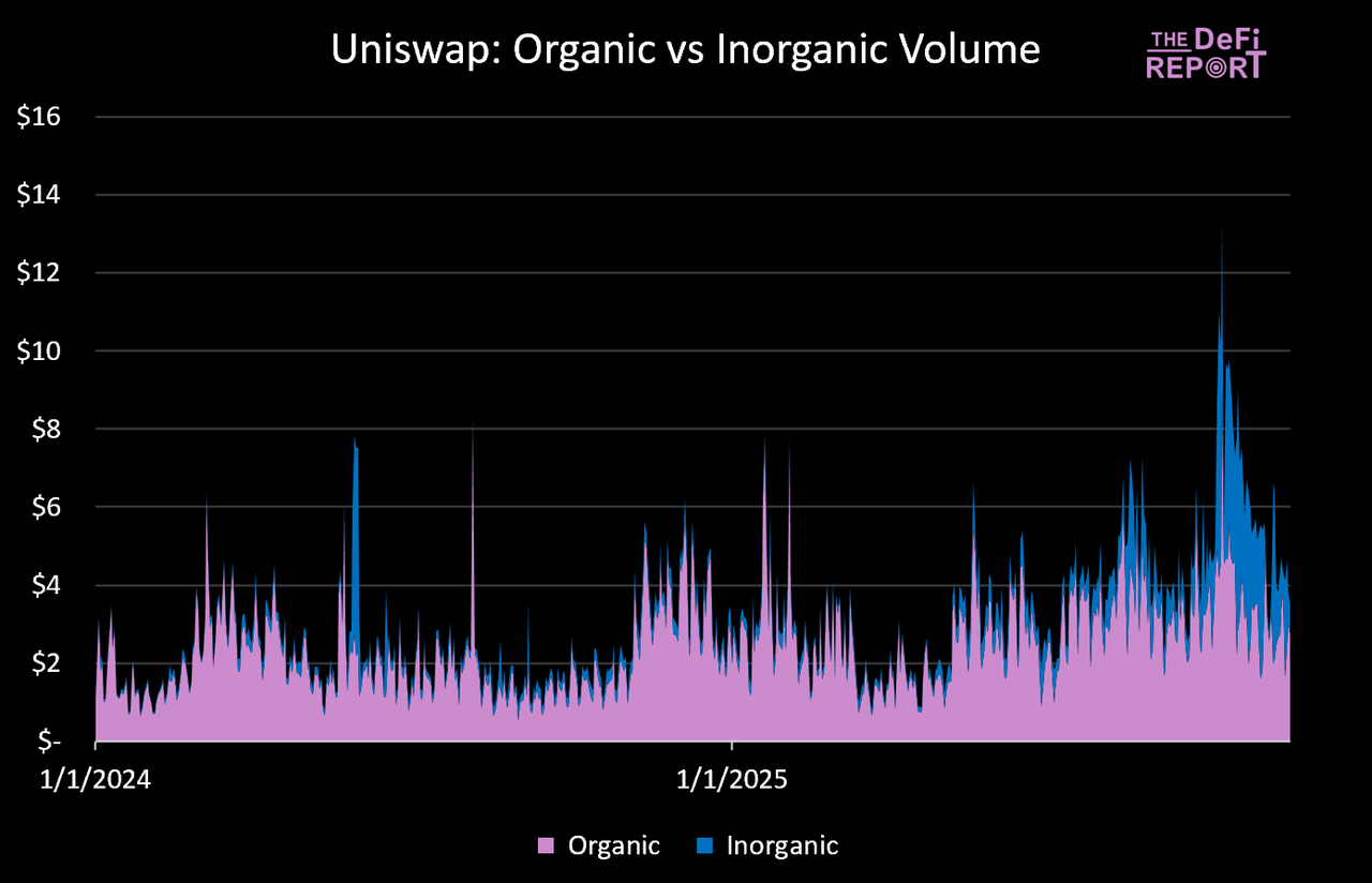 通过应用这些筛选条件,我们发现 2024 年 Uniswap 交易量的 12.3% 为「无机交易量」。2025 年,这一比例几乎翻了一番,达到 23.3%。更值得注意的是,在 10 月 10 日清算事件之后,「无机交易量」出现了大幅飙升,占比一度飙升至 43%。