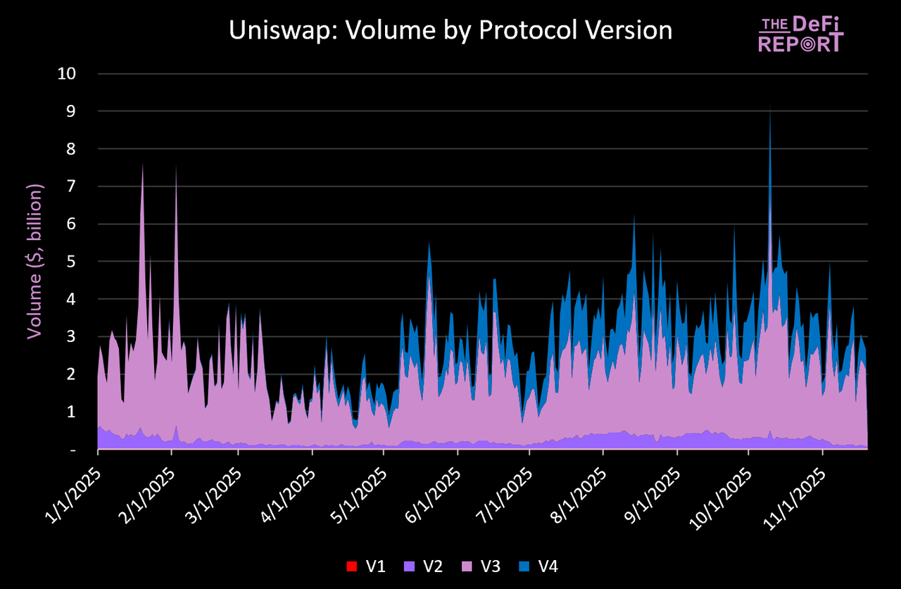 尽管本轮周期大部分投机活动转向了 Solana 和 Hyperliquid,但 Uniswap 的交易量依然保持增长。该协议在 10 月 6 日当周的交易量达到峰值 340 亿美元,比 2021 年周期中的最佳单周交易量增长了 50%。