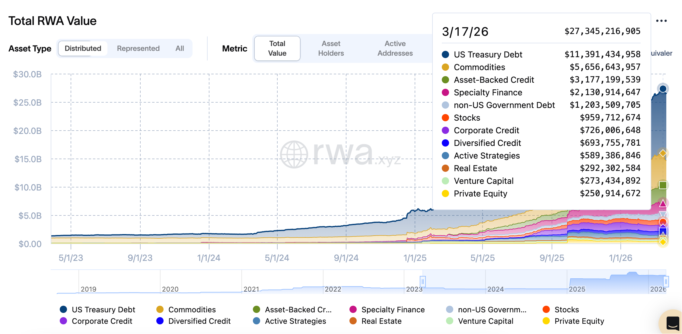 值得一提的是,随着监管框架的逐步清晰,传统资本市场与代币化技术的融合正进入实质性阶段。本月中旬,美 SEC 已批准纳斯达克代币化股票交易试点项目,为代币化资产的规模化交易奠定了基础。在此之前,随着一系列的政策松绑,贝莱德、富达、富兰克林邓普顿等头部资管机构均已加速布局。RWA.xyz 数据显示,3 月 17 日,全球代币化现实世界资产总规模一度突破 270 亿美元,达到约 273.45 亿美元,较 2025 年同期增长超 284%,创下历史新高。