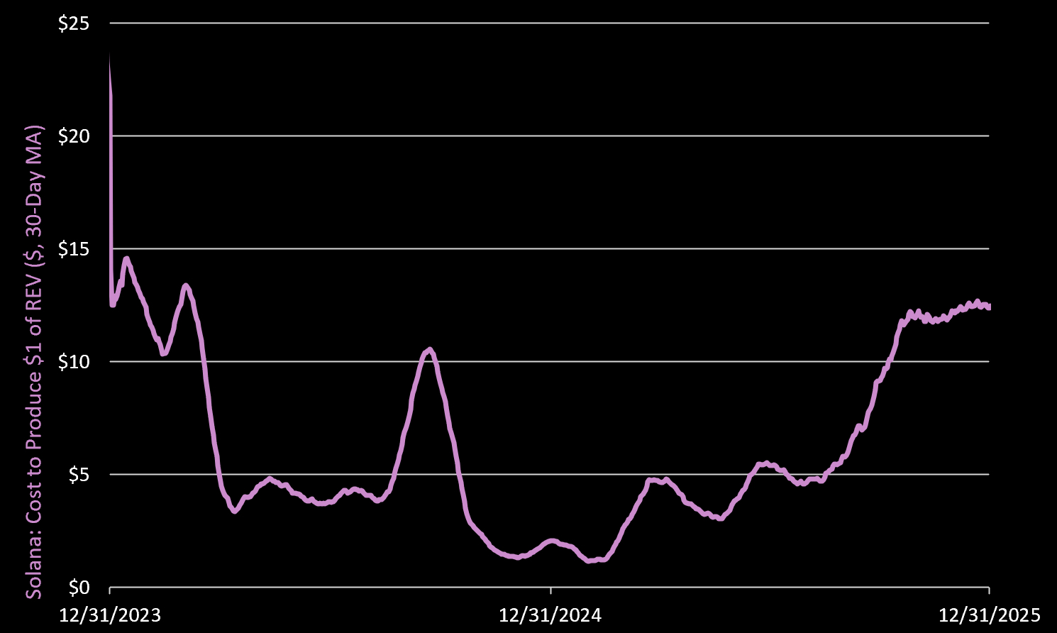 Solana 网络似乎正进入一个周期性调整阶段。链上投机需求持续下降,而新的应用场景和传统金融(TradFi)的接入尚未能填补这一需求缺口。具体来看,Solana 第四季度(Q4)的运营表现显著减弱,收入(REV)大幅缩减 43%,降至自 2023 年第三季度以来的最低水平。此外,本季度链上实际收益率也大幅下降 56%,跌至 0.46% 的低水平。与此同时,随着用户活跃度的降低,Solana 网络的基本面状况也在恶化,运营成本相对于用户支付的费用呈现出上升趋势。