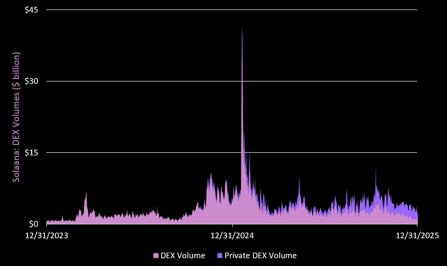 第四季度,Solana 网络上的私有去中心化交易所(DEX)交易量大幅增长。总交易量日均达 22 亿美元(占所有 DEX 交易量的 48%),较第三季度增长 50%。