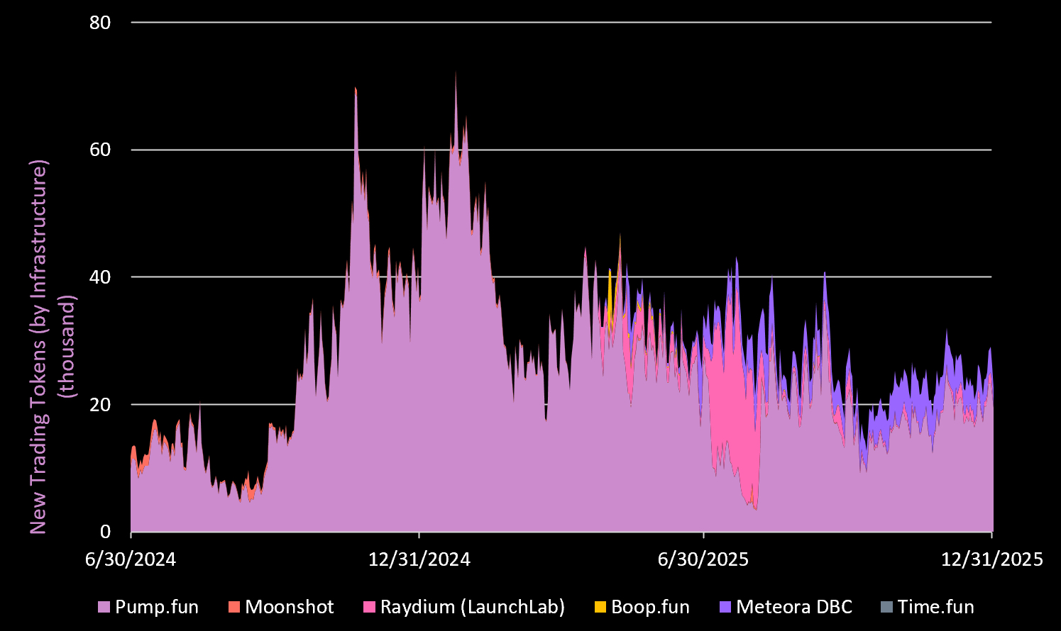 第四季度 Solana 平台上共创建了 210 万枚代币,比第三季度下降了 24%。Pump Fun 继续引领市场,第四季度新增代币 160 万枚(市场份额 75%)。