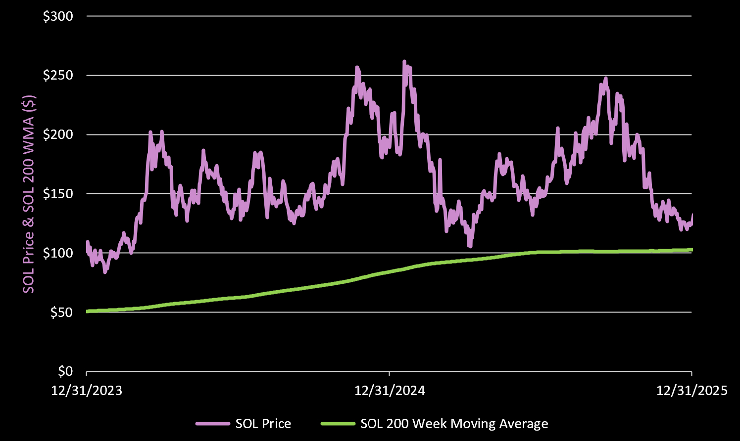 我们也预计 SOL 价格最终会回落至其 200 周长期移动均线附近。目前该均线位于 103 美元。
