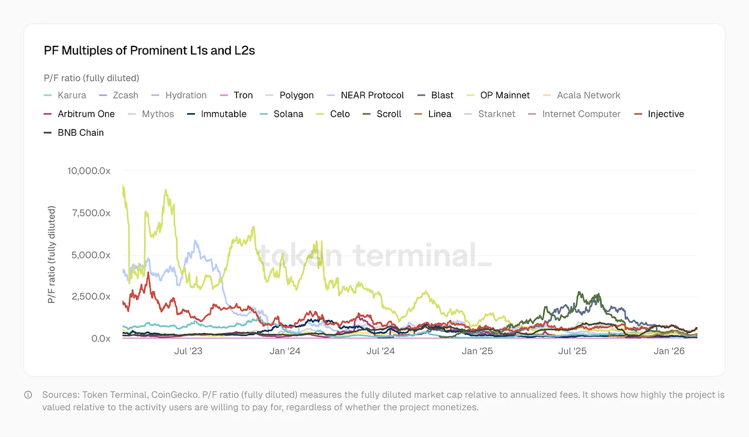 单独来看,Optimism、Solana、Arbitrum 和 Polygon 近年来实现了更复杂的产品。它们拥有更多用户、更好流动性以及更复杂的金融应用套件。但是,它们价格与费用的比率所呈现出的折扣幅度,反映出市场的评价情况。