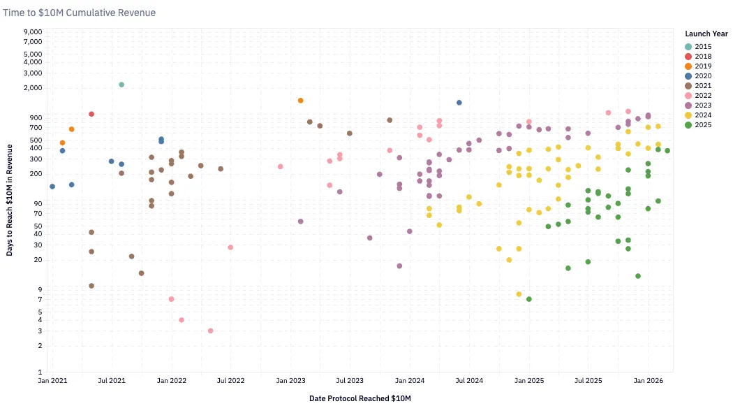 自 2020 年代初以来,每个季度营收超过百万美元的团队数量稳步增长,目前已超过一百个。2020 年,那些需要 24 个月才能达到年营收 1000 万美元的协议都被认为是快速增长的。而到了 2024 年,达到这一标准的协议只需大约 6 个月。Pump.Fun 于 2024 年初推出,仅用了大约两个月就达到了 1000 万美元的营收,创下了最快的增长速度纪录。