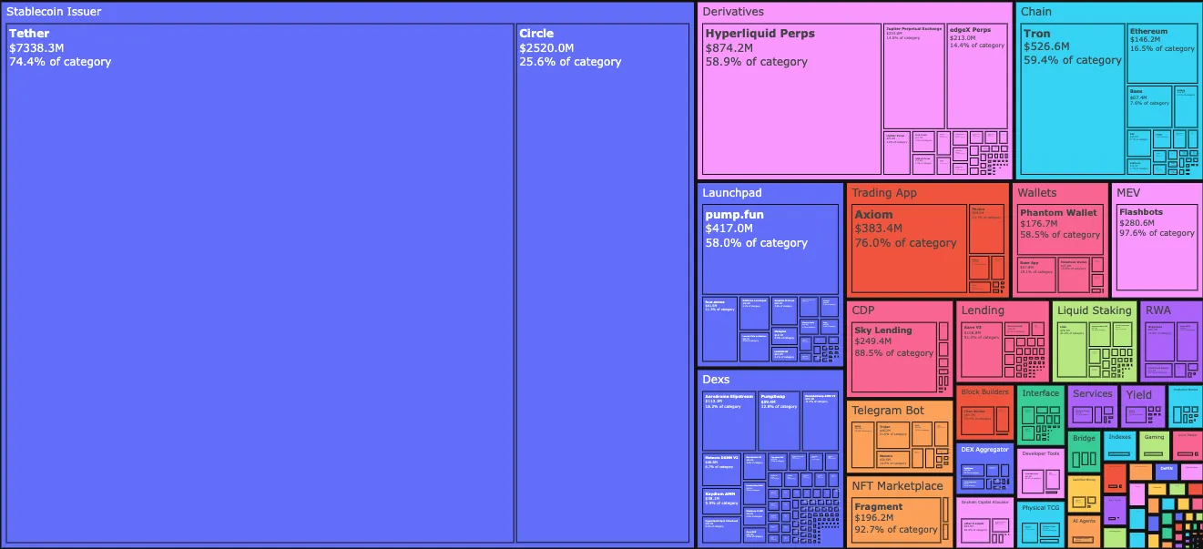 2026 年 1 月,稳定币发行商 Tether 和 Circle 占所有手续费的 34.3%。换言之,加密行业每赚 1 美元,就有 0.34 美元流向这两家公司。它们的收入从 2023 年 1 月的 49.5 亿美元翻倍至 2025 年的 98.9 亿美元,几乎完全由美国国债驱动。值得注意的是,Tether 的收入几乎是 Circle 的三倍。虽然这些指标对于银行规模的金融产品而言,仅相当于初创公司的水平。它们的崛起归功于两方面因素: