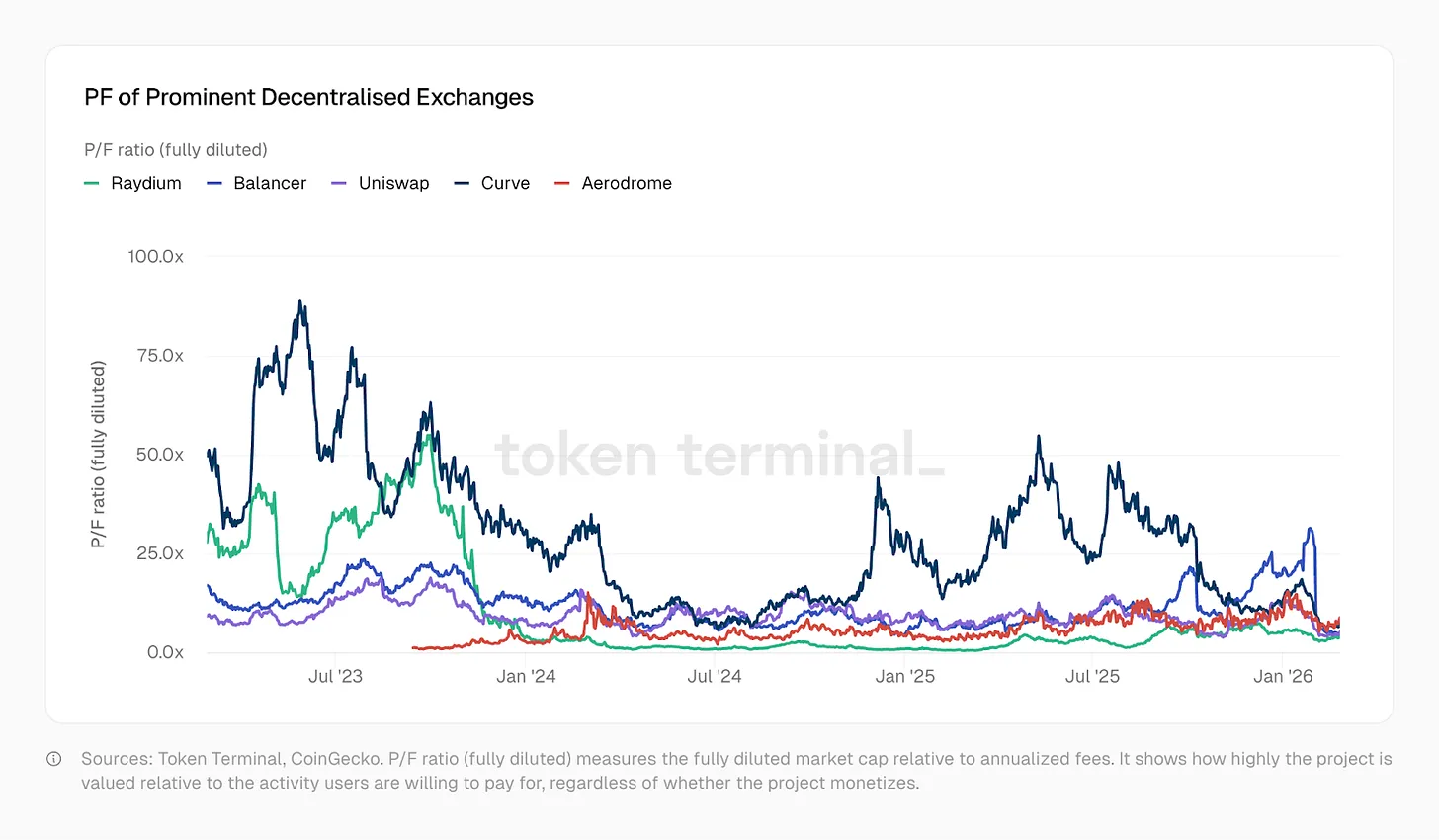 以 DeFi 基础项目为例。投资者选择权和新颖性的缺失扼杀了估值,即便这些基础项目确实推动了更多经济活动。这些市场高度碎片化,投资者有众多选择可以押注。但是,「去中心化」或基于区块链的新颖性早已消失。因此,Kamino、Euler、Fluid、Meteora 和 PumpSwap 等项目相继涌现,但它们的价格费用比均低于 2022 年协议的水平。如下方 TokenTerminal 图表所示,去中心化交易所的价费倍数在 2023 年至 2025 年间大幅下降。一些交易所的市销率现在甚至低至 1。