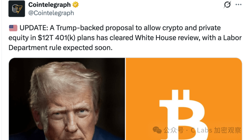 预计劳工部将在未来几天内正式发布规则: 允许总额高达 10 万亿美元的 401(k) 计划,将加密货币和私募股权(Private Equity)纳入投资组合。