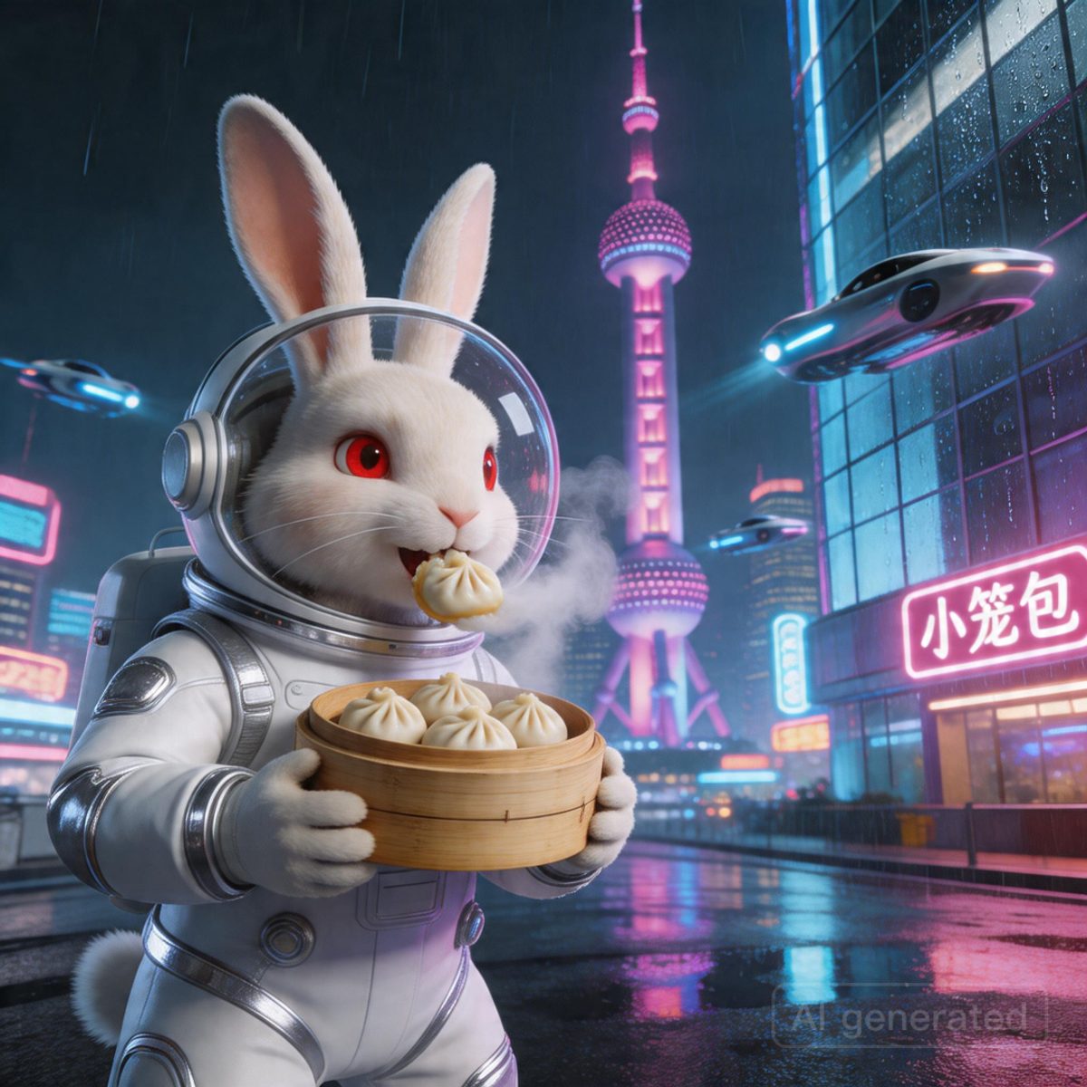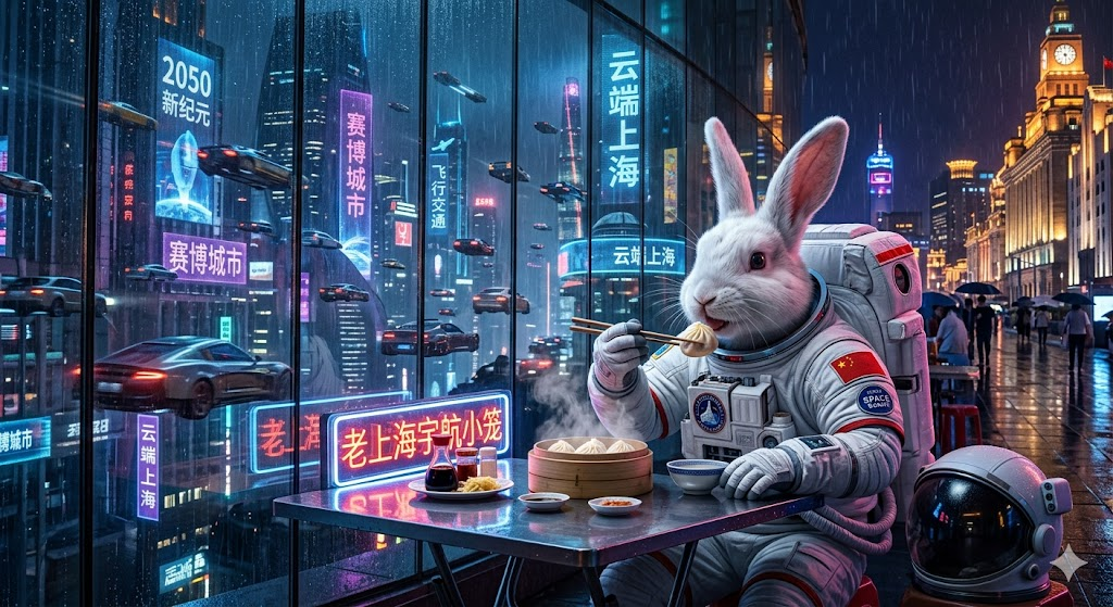 测试 prompt: 「一个穿着白色宇航服的兔子在霓虹灯闪烁的上海外滩吃热气腾腾的小笼包,身后是雨夜反光的玻璃幕墙,倒映出 2050 年飞车穿梭的赛博朋克景象,电影级光影,超现实细节,8K 画质。」