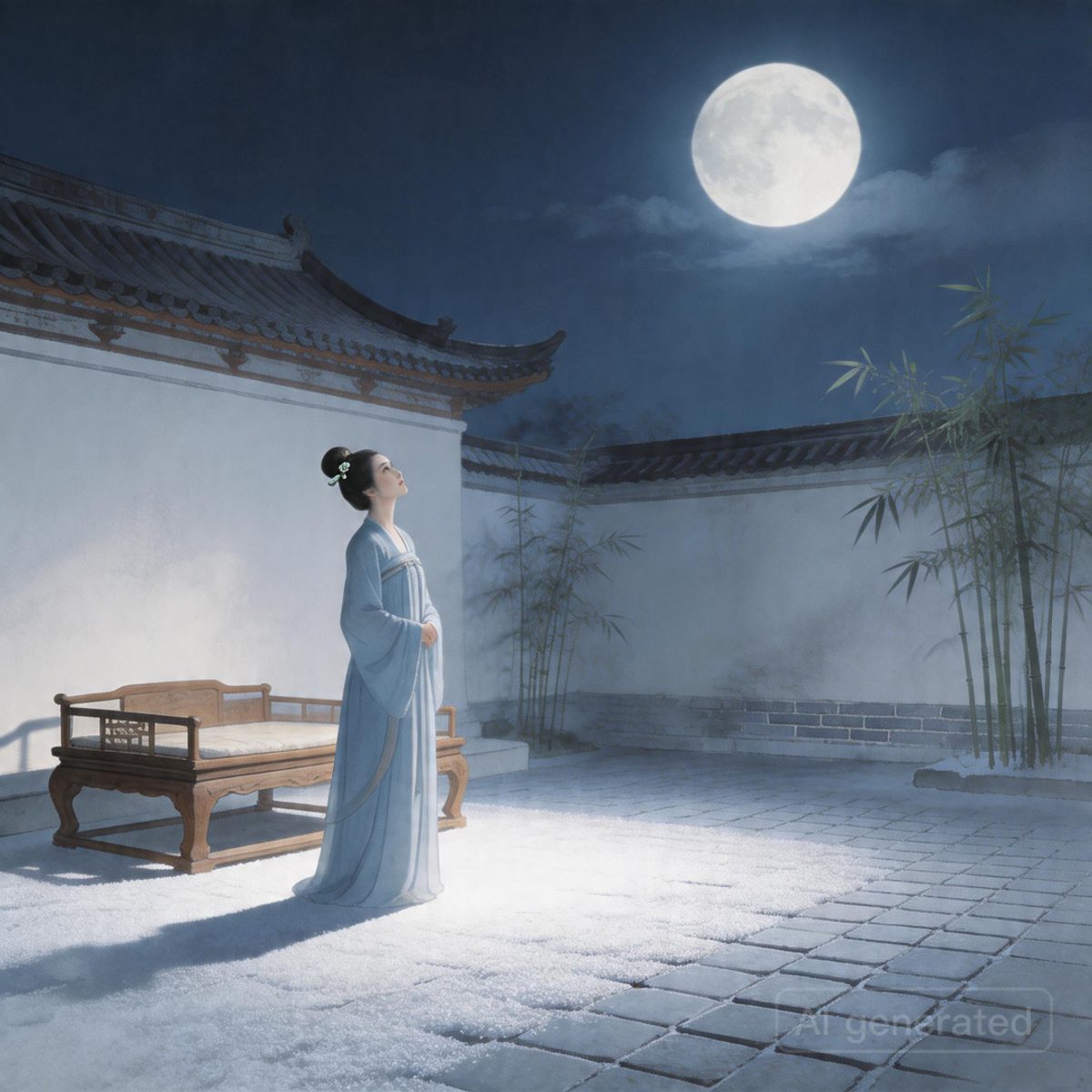 测试 prompt: 「李白《静夜思》意境:床前明月光,疑是地上霜。一位古风女子在唐代庭院里抬头望月,月光洒在青砖白墙,水墨意境与现实光影自然融合,电影级氛围。」