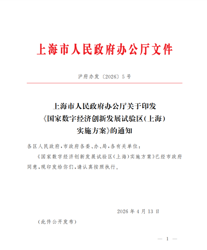 2025 年 10 月,国家数据局一场专题新闻发布会上,七个试验区的建设方案首次集中亮相,被提炼为涵盖数据要素、基础设施、产业创新等七大领域的 158 项改革事项清单。2026 年 4 月 21 日,上海市人民政府官网发布《国家数字经济创新发展试验区(上海)实施方案》,文号沪府办发〔2026〕5 号,落款 4 月 13 日,七个试验方向被浓缩为 7 大任务、30 条措施。至此,上海成为继广东、四川之后第三个亮出「国家级数字经济试验方案」的地区。