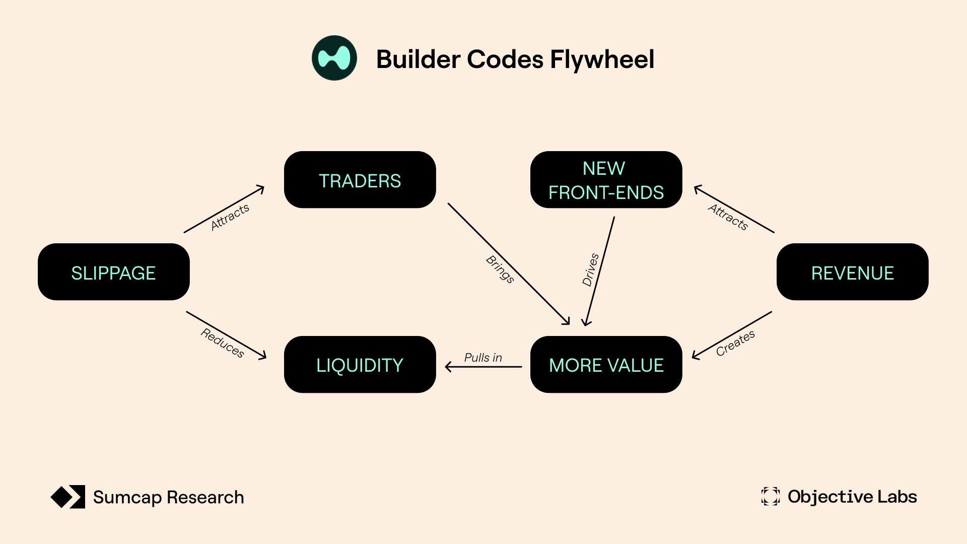 HyperLiquid 通过 Builder Codes 改变了这种模式,它允许任何团队将其前端免费接入 HyperLiquid 的订单簿,让构建者在用户通过其界面交易时通过共享费用赚取收入。开发者能够利用 HyperLiquid 经过实战检验的核心基础设施,以更快的速度和更低的成本创建新的流动性场所。而这造就了下图这么一个飞轮: