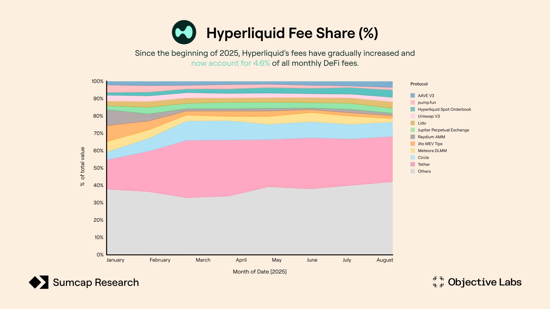 2025 年初时,HyperLiquid 在 DeFi 生态中还只是个小角色,仅捕获行业总费用的约 1.6%。但这一局面迅速改变。随着时间推移,HyperLiquid 的市场份额稳步增长,目前已占所有 DeFi 月度协议费用的约 4.6%。