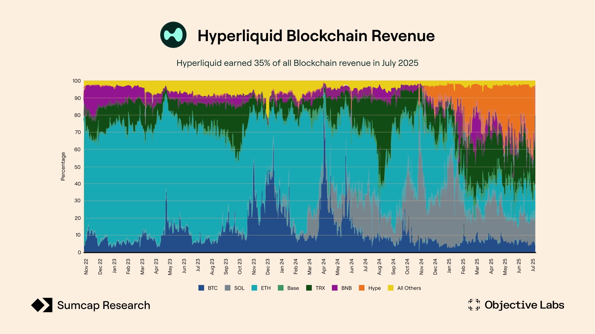 HyperLiquid 7 月份的收入占当月所有区块链网络总收入的三分之一以上。这一创纪录的成果使 HyperLiquid 与主要通用智能合约区块链并列,引发了关于传统网络价值捕获模式的讨论。