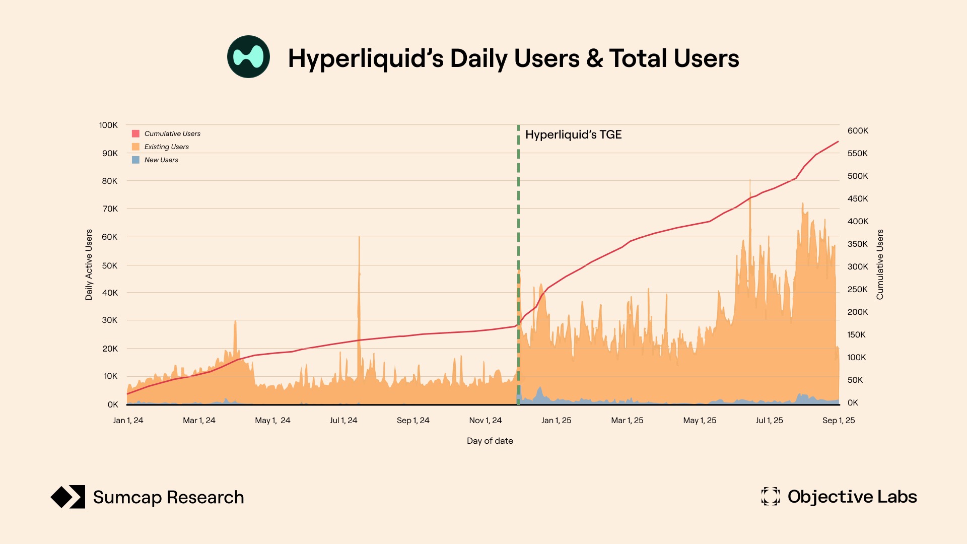 2025 年,HyperLiquid 持续扩大其在去中心化永续合约市场的影响力,实现了新用户的快速增长和持续的高交易量参与。在 Web3 领域,这算是一个罕见的案例:代币发行不仅奖励了早期用户,更极大地增强了发展势头,将获得丰厚回报的交易者转变为积极的宣传者。TGE 后的几天场面火爆:48 小时内创建了超过 11,000 个新账户,并且每日活跃用户数(DAU)每周持续创下新高。