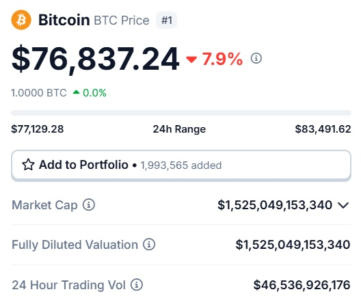 就在传统大宗商品哀鸿遍野之际,加密资产市场同样未能幸免。比特币在 2 月 1 日凌晨跌破 8 万美元大关,整个加密市场市值在 24 小时内蒸发约 1110 亿美元。统计数据显示,全网有超过 40 万名投资者在这一波行情中惨遭爆仓,约 25 亿美元的资产在瞬间化为乌有。